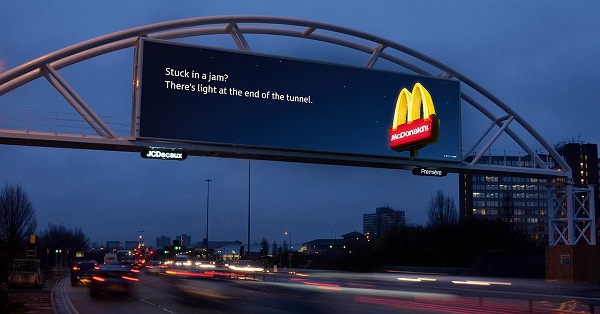 Chuỗi thức ăn nhanh McDonald’s cùng Leo Burnett thực hiện chiến dịch đặt các digital billboard thay đổi theo mật độ giao thông trên 10 thành phố Anh. Quảng cáo thu thập dữ liệu từ API của Google Traffic và thay đổi sáng tạo khi lưu lượng giao thông thay đổi.