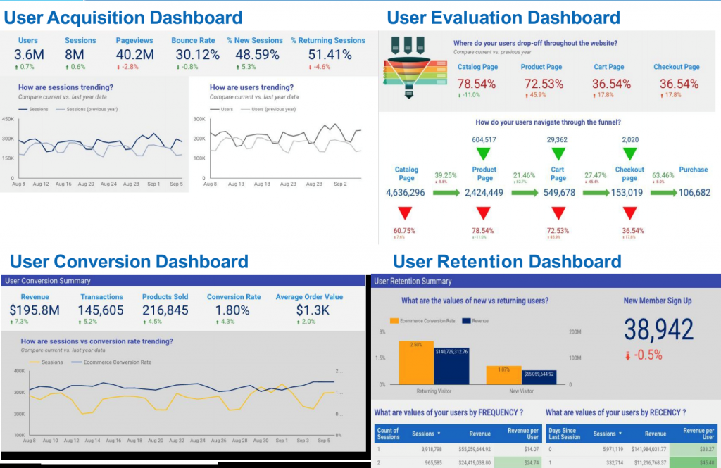 - CEO/ Quản lí sẽ nhìn thấy được những chỉ số mà họ quan tâm nhất : acquisition, evaluation, conversion và retention. Tránh phải bơi trong 1 đống metrics và biểu đồ phức tạp.