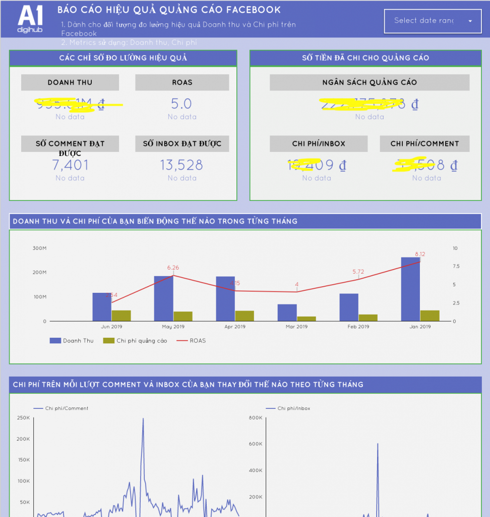 Google data studio là 1 sản phẩm của Google, cho phép bạn visualize mọi loại dữ liệu thành các bảng biểu và chỉ số tự động. Tableau, vừa được Saleforce mua lại(1) còn xịn hơn Data studio. Phương pháp này giúp các bạn sẽ ra được những loại report rất cool như hình dưới đây: