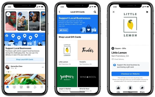 Facebook tiếp tục triển khai một số công cụ mới để hỗ trợ các doanh nghiệp nhỏ bị ảnh hưởng bởi đại dịch có thể kết nối với khách hàng của họ thông qua Facebook. Tính năng chủ yếu trong lần bổ sung này là một danh sách các thẻ quà tặng (Gift card). Khi khách hàng truy cập vào mục này, họ có thể tìm thấy các thẻ quà tặng kỹ thuật số được cung cấp bởi các doanh nghiệp, nhà hàng địa phương yêu thích của mình.