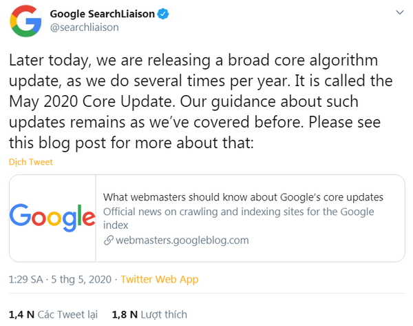 Tạm dịch như sau: “Sau ngày hôm nay, chúng tôi sẽ công bố bản cập nhật thuật toán cốt lõi trên diện rộng, điều mà chúng tôi thường làm vài lần mỗi năm. Nó có tên gọi là “the May 2020 Core Update”. Các hướng dẫn của chúng tôi về bản cập nhật lần này vẫn như chúng tôi đã đề cập trước đây”.
