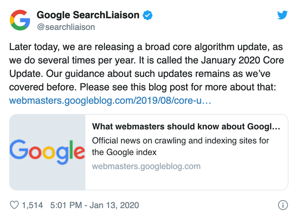 Thông báo cập nhật lõi mở rộng “The January 2020 Google Core Update”.