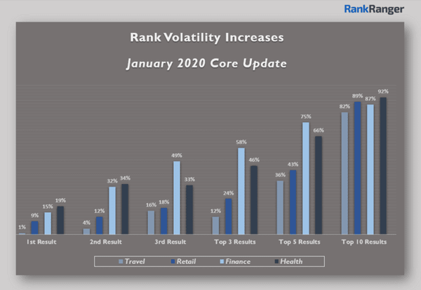 Theo RankRanger vào thời điểm ấy cho biết, các website theo YMYL (Your Money Your Life) bị tác động sâu sắc, những lĩnh vực về tài chính và sức khỏe tăng một cách đáng kinh ngạc nếu nó thực sự mang lại giá trị cho người đọc. Dựa vào biểu đồ bạn có thể dễ dàng nhận ra điều này.